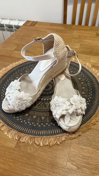 Preciosas alpargatas de cuña para novia de la marca Mireia Bridal. Son de color beige y tienen una decoración floral en la parte delantera. Ideales para una boda cómoda y elegante. - Cuña cómoda y estable. - Detalle floral con pedrería. - Perfectas para un look nupcial.