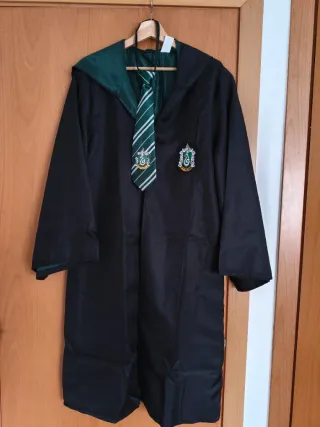 Conjunto de capa y corbata de Slytherin de Harry Potter. - Unisex. - Largo 112cm. - Capa negra con detalles verdes. - Corbata a rayas verdes y blancas con el escudo de Slytherin. - Parche de Slytherin en la capa.
