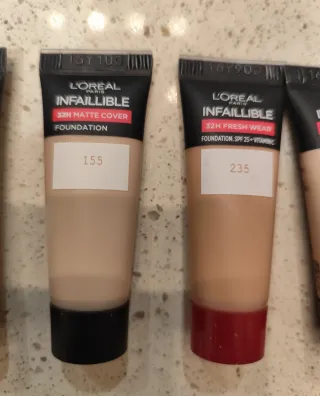 Lote de 6 mini bases de maquillaje L'Oréal Infallible. - Tono 132: 32H Fresh Wear Foundation SPF25. - Tono 110: 32H Matte Cover Foundation. - Tono 155: 32H Matte Cover Foundation. - Tono 235: 32H Fresh Wear Foundation. - Tono 135: 32H Matte Cover Foundation. - Tono 125: 32H Fresh Wear Foundation.