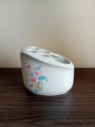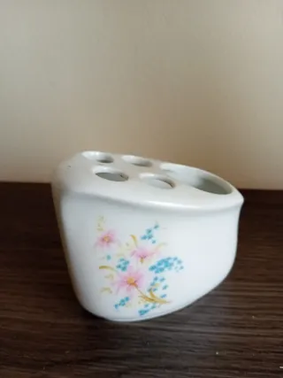 Elegante portacepillos de cerámica con un delicado diseño floral. - Diseño curvo y moderno. - Aberturas para varios cepillos. - Adornado con flores rosas y azules. Cepillo dental,crema ,pasta de dientes,baño,espejo,accesorios,mueble ,hilo dental,bañera ,grifo,wc