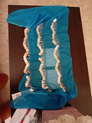 Pañuelo de danza del vientre con un diseño llamativo y adornos. - Adornado con múltiples filas de monedas doradas. - Tejido ligero y fluido en color azul. - Talla única.