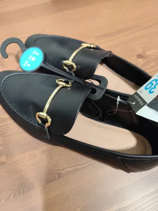 Mocasines negros de Primark con detalle dorado. - Diseño elegante y cómodo. - Talla 39 EUR. - Detalle metálico en la pala.