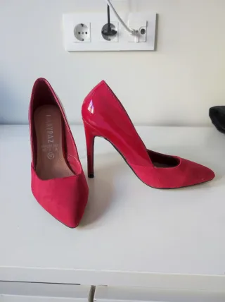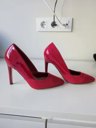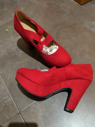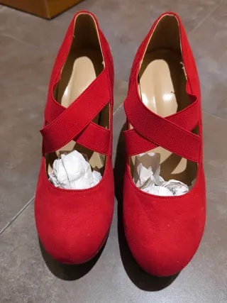 Elegantes zapatos rojos con tacón y plataforma. Me quedan grandes y no podía devolverlos. - Material tipo ante. - Diseño con tiras cruzadas en el empeine. - Tacón grueso y estable.