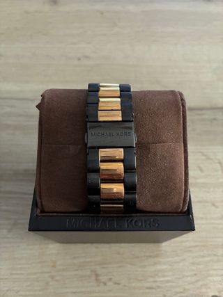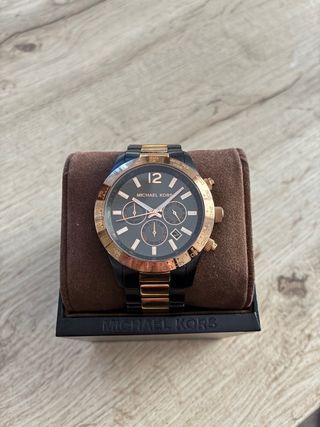 Reloj Michael Kors modelo MK8208 con detalles en negro y oro rosa. - Esfera oscura con detalles metálicos. - Correa de eslabones combinando negro y oro rosa. - Bisel con marcadores de tiempo.