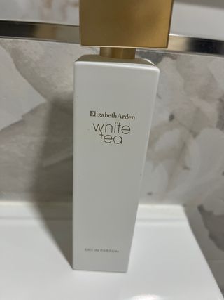 Eau de Parfum White Tea de Elizabeth Arden. Botella blanca con detalles dorados. Sin uso.