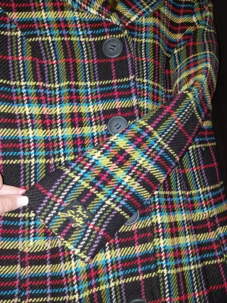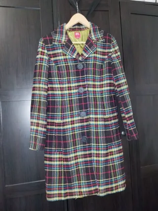 Abrigo de la marca Miss Sixty con un diseño de cuadros vibrante. - Diseño de cuadros llamativo. - Forro interior de color verde lima. - Cierre de botones al frente.