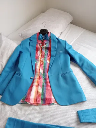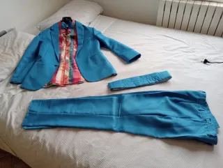 Conjunto de vestir cuatro piezas compuesto por chaqueta, camisa, pantalón y faja. - Chaqueta de color azul. Hombros 44 cm. - Camisa estampada a cuadros. - Pantalón a juego con la chaqueta. Largo 105 cm. Cintura ajustable máx 86 cm. mín 74 cm. - Incluye faja a juego.