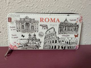 Monedero sin estrenar con diseño inspirado en Roma, Italia. Presenta ilustraciones de monumentos icónicos como el Coliseo, la Fontana di Trevi, la Plaza de España y el Vaticano. - Cierre de cremallera. - Diseño detallado con motivos florales y mariposas. - Comprado en Roma.