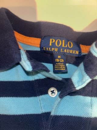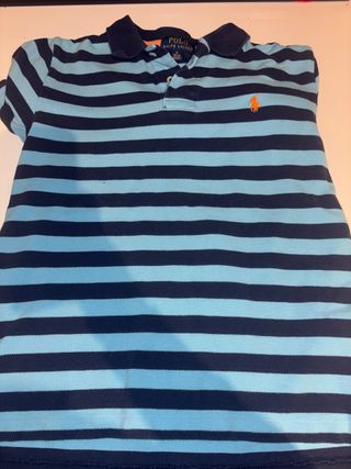 Polo de manga corta con rayas azules y marino. - Cuello clásico. - Logo de caballo naranja bordado en el pecho. - Cierre de dos botones.