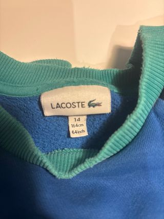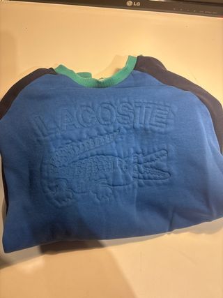 Sudadera de la marca Lacoste con un diseño llamativo. - Logo de Lacoste en relieve en la parte frontal. - Cuello redondo con ribete verde. - Mangas de color azul y negro.