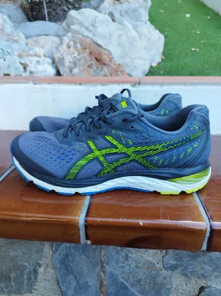 Zapatillas deportivas Asics con un diseño moderno y llamativo. - Parte superior de malla transpirable. - Detalle de líneas en color verde neón. - Suela con amortiguación para mayor comodidad.