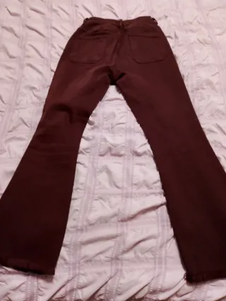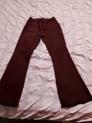 Vaqueros de mujer de corte acampanado. - Diseño con bolsillos delanteros. - Cintura con cierre de botones. - Bajo deshilachado.