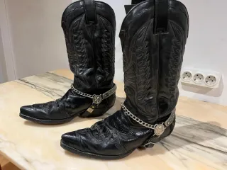 Botas de estilo western en cuero negro, con detalles de bordado y cadena decorativa. - Diseño clásico de bota campera. - Cadena plateada con detalles de estrella. - Puntera afilada. - Tacón con forma.