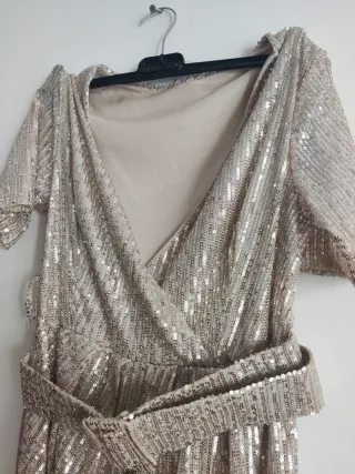 Elegante vestido de fiesta con lentejuelas brillantes. Ideal para eventos especiales. Es taya única pero da hasta una L - Diseño cruzado. - Cinturón a juego. - Manga corta. - Abertura delantera