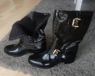 Botas de agua en perfecto estado, solo usadas una vez. - Diseño brillante con detalle de hebilla. - Acabado texturizado en la parte superior.