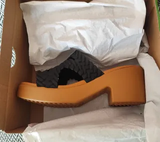 Sandalias Crocs Brooklyn en color negro, talla 40. Son nuevas y vienen en su caja original. - Diseño con tiras entrelazadas. - Plataforma cómoda. - Suela con relieve.