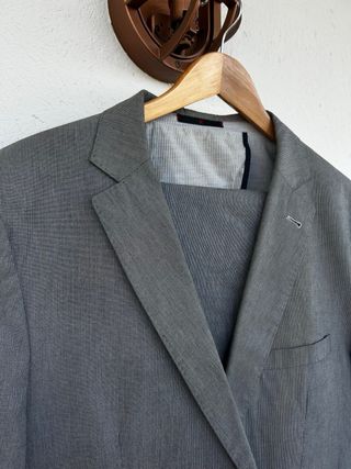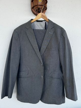 Elegante traje de Massimo Dutti en color gris oscuro. Perfecto para ocasiones formales. Prácticamente nuevo. Usado literalmente 1 sola vez. - Diseño clásico con raya diplomática. - Chaqueta de dos botones. - Puños con botones. - Bolsillos frontales con solapa.