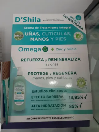 Crema de tratamiento integral para uñas, cutículas, manos y pies. - Contiene Omega 6, Zinc y Silicio. - Refuerza y remineraliza las uñas. - Protege y regenera manos, pies y cutículas. - Estudios clínicos de efecto barrera: mejora la eficacia dermoprotectora en un 13,95% a las 3h. - Estudios clínicos de alta hidratación: mejora la eficacia dermoprotectora en un 65% a las 2h. - Formulación con Agua de Manantial.