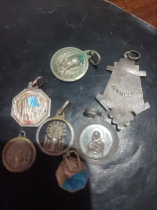Conjunto de medallas religiosas con detalles en esmalte azul y plata. - Medalla octogonal con imagen de la Virgen María y esmalte azul. - Medalla redonda con imagen de la Virgen y detalles plateados. - Medalla con forma de escudo con inscripción SMONTSE.