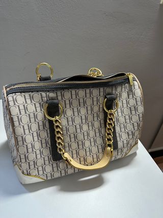 Elegante bolso de CH Carolina Herrera con un diseño distintivo. - Patrón de iniciales CH repetidas. - Detalles en dorado. - Asas y adornos en piel. - Cremallera superior. Las asas las tiene peladas pero no se nota y queda bien, de ahí su precio. Por lo demás el bolso esta impecable. Solo hago envios por Impost