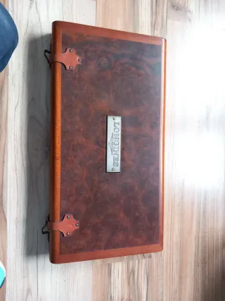 Elegante caja para guardar relojes de la marca Longines. Presenta un diseño clásico y sofisticado. - Acabado exterior en madera con veteado distintivo. - Detalle de remaches y correas de cuero en los laterales. - Placa metálica con el logo de Longines en la parte frontal.