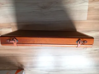 Elegante caja para guardar relojes de la marca Longines. Su diseño combina madera con detalles en piel. - Acabado en madera con veta. - Cierre con correas de piel y remaches. - estado de la caja, ver fotos