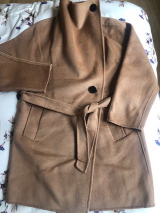 Elegante abrigo de Zara en color camel, perfecto para añadir un toque sofisticado a tu armario. - Mangas amplias, corte recto y ancho, largo del abrigo 3/4. - Diseño con cuello alto. - Cierre con botones. - Cinturón para ajustar la cintura. - Bolsillos laterales.