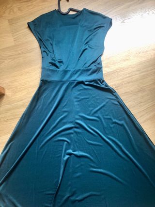Elegante vestido de fiesta de Mango, ideal para ocasiones especiales. - Color verde azulado oscuro o turquesa profundo. - La tela tiene un acabado satinado sedoso y fluido. - Diseño con escote en V pronunciado. - Cintura marcada con fruncido. - Largo midi. - Mangas cortas tipo casquillo. - Cremallera lateral invisible.