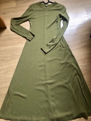 Vestido largo de manga larga, verde militar. - Tejido de algodón en canalé. - Corte muy cómodo. - Tejido suave y fluido.