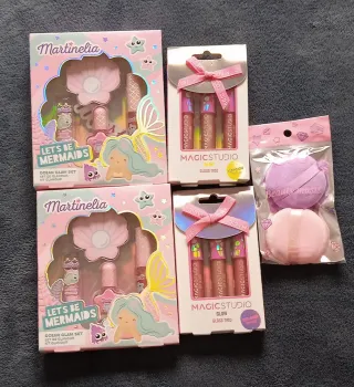 Conjunto de maquillaje infantil con temática de sirenas. - Dos sets de Let's Be Mermaids que incluyen brillo de labios, pintalabios, pintauñas y lima. - Dos sets de Magicstudio con brillo de labios. - Dos esponjas de maquillaje Beauty Musts.