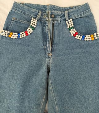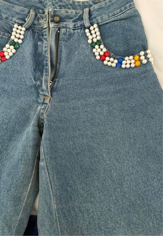 Pantalón vaquero de estilo vintage con un diseño único. - Detalle de pedrería y abalorios en los bolsillos. - Combinación de perlas y gemas de colores. - Corte clásico de jeans.
