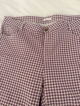Pantalón de mujer con estampado de cuadros Vichy. - Diseño de cuadros morado y blanco. - Cintura con botón y cremallera. Elàsticos