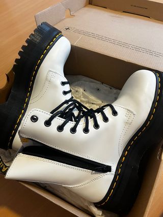 Botas de plataforma Dr. Martens en color blanco, con cordones negros y cremallera lateral. - Diseño de plataforma. - Cremallera lateral para fácil acceso. - Costuras amarillas características. Usado 1 vez Talla 38