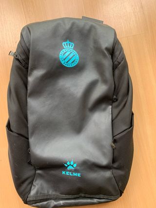Mochila con el escudo del RCD Espanyol y el logo de Kelme. - Diseño en color negro con detalles en turquesa. - Escudo del RCD Espanyol. - Logo de Kelme.