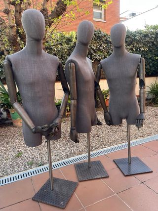 Conjunto de tres maniquíes masculinos de diseño, ideales para escaparates o exposiciones. - Estructura de tela gris. - Brazos articulados de madera. - Bases metálicas estables.