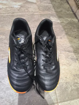 Zapatillas de fútbol sala Joma en color negro con detalles en naranja. Perfectas para jugar en pistas interiores. - Cierre con cordones. - Diseño deportivo. Modelo Toledo