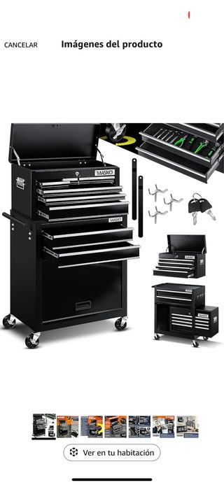 Carrito de herramientas MASKO de color negro, ideal para organizar tu espacio de trabajo. - Dimensiones generales: 108 cm de alto, 60 cm de ancho y 33 cm de profundidad. - Incluye 7 cajones de diferentes tamaños (A-G) con medidas detalladas en la imagen. - Ruedas giratorias 360° con freno para fácil movilidad y seguridad. - Incluye ganchos y alfombrillas antideslizantes.