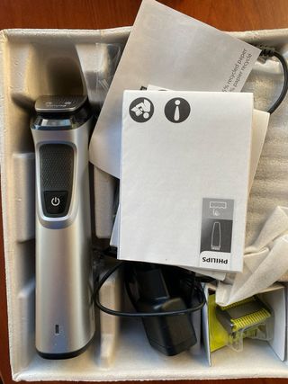 Afeitadora multifunción Philips Serie 9000 Prestige, ideal para el cuidado personal completo. - 12 funciones en 1 para estilo y afeitado. - Incluye 11 ajustes de longitud (0.2-12mm). - Cuchillas autoafilables de metal. - Batería Li-Ion con 120 min de autonomía y carga rápida de 1 hora. - Diseño elegante en color plata y negro.