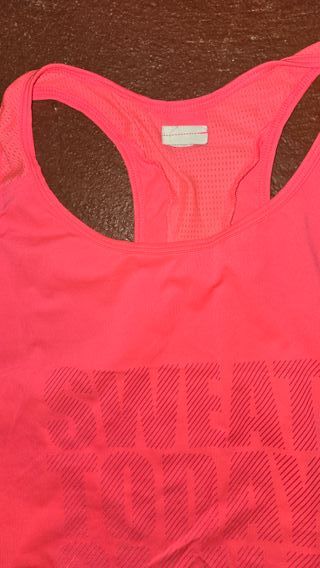 Camiseta deportiva de la marca Domyos, ideal para entrenamientos. - Diseño de tirantes. - Tejido transpirable con microperforaciones. - Detalle de texto SWEAT TODAY en la parte frontal.