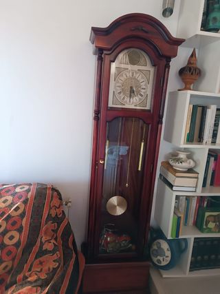 Elegante reloj de pie con una estructura de madera oscura. Su diseño clásico lo convierte en una pieza decorativa para cualquier hogar. - Mecanismo de péndulo visible. - Esfera con números romanos. - Puerta de cristal para acceso al interior.