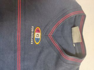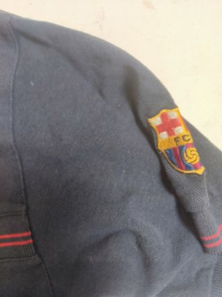 polo del FC Barcelona con un diseño clásico y deportivo. - Logo bordado del FC Barcelona. - Detalles de rayas rojas en el cuello y los costados. - Cuello en V. Talla L