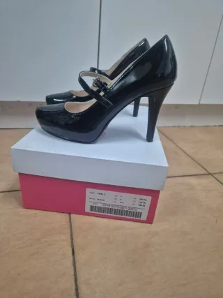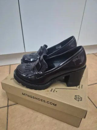 Elegantes mocasines de la marca Mustang en talla 37. Un calzado con un diseño clásico y moderno a la vez. - Acabado brillante. - Detalle de flecos en la pala. - Suela gruesa y resistente. Zapato tacon de charol color burdeos. Usado sola una vez. Están como nuevos. Plataforma: 2 cm Tacon: 7 cm Pie: 23,5 cm
