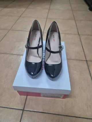 Elegantes zapatos de salón de charol. - Diseño de tira al tobillo con hebilla. - Tacón alto y puntera fina. Bonito zapato de tacon, estilo merceditas sin usar. De charol. Plataforma: 2 cm Tacon: 10 cm Pie: 24 cm