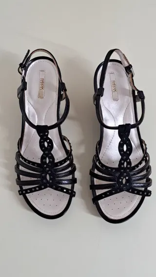 Sandalias de cuña Geox en color negro. Diseño elegante con tiras y detalles. - Tira ajustable al tobillo. - Suela con tecnología Geox Respira. - Usadas en dos ocasiones. - En su caja original. - Tacón de cuña 9,5 cm. - Plataforma de 2,5 cm.