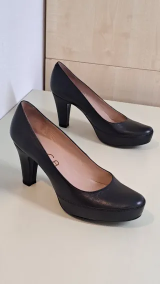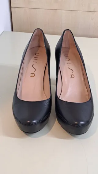 Elegantes zapatos de salón con tacón de la marca Unisa. Usados dos ocasiones. En su caja original. - Tacón grueso 9 cm. y plataforma 2 cm.. - Diseño clásico y versátil. - Material exterior e interior de piel.