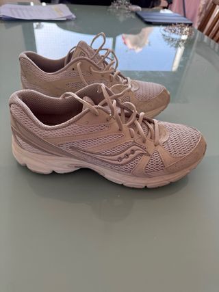 Zapatillas deportivas Saucony en tonos beige y plata. Perfectas para el día a día. - Diseño de malla transpirable. - Detalles plateados. - Cierre con cordones. Se vende por ir pequeñas, como se puede ver tienen muy poco uso.