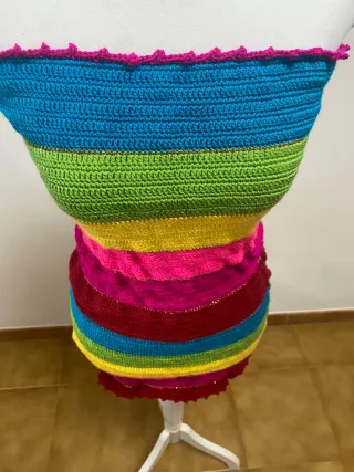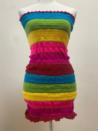 Vestido tejido a mano tipo Strapless, con diseño de franjas multicolor vibrantes. Ajuste ceñido que resalta la figura,tela elástica y cómoda. Ideal para verano, playa o salidas casuales. Pieza única y llamativa. Talla S/M