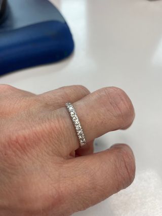 Elegante anillo de oro blanco de 18 quilates adornado con diamantes. - Diseño clásico y atemporal. - Acabado brillante. Oro blanco de 18 kt / 750 mm 14 diamantes talla brillante full cut de 2,10 mm cada uno Peso total del oro: 2,94 g de 18 kt Peso total diamantes: 0,57 quilates – Calidad G-SI Peso total del anillo: 0,55 quilates