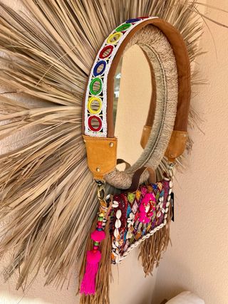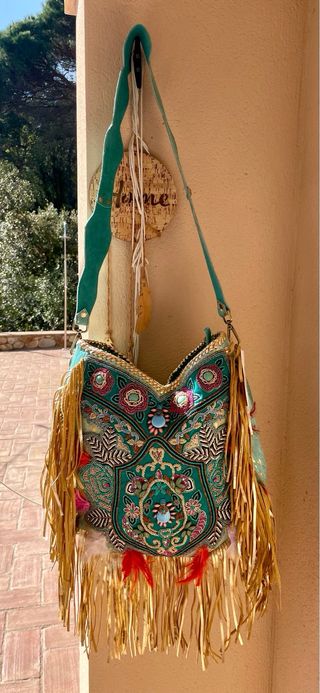 Bolso de piel con un diseño bohemio y detalles elaborados. - Adornado con bordados y pedrería. - Flecos dorados y plumas decorativas. - Asa larga.