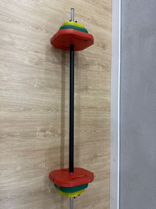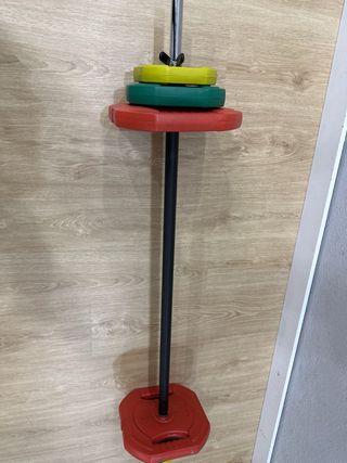 Set de body pump para entrenar en casa o el gimnasio. Incluye barra y discos de diferentes pesos. - Discos de colores: rojo, verde y amarillo. - Barra de acero. - Cierres de seguridad para los discos.